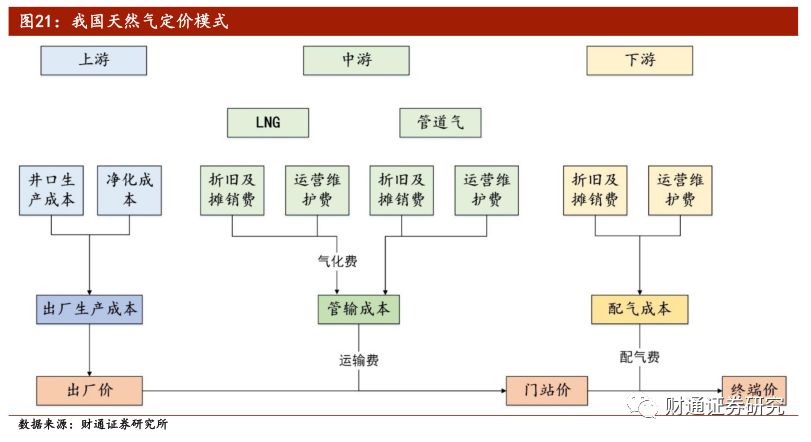 天然气产业链上下游各个环节主要包括出厂价、门站价和终端价。门站价:政府根据替代能源价格制定终端价格,放开出厂价,长输管道管输费用由政府制定。省网管输费:覆盖省内的主干管网相关管输费用由政府部门统一核审、制定。城燃配气费:各地区城市燃气公司相关收益率及配气费用等统一由政府部门规定。零售价格:管道气领域居民/非居民用气价格普遍由当地政府核准公布,CNG领域上游定价由市场决定,下游零售部分地区业已放开。