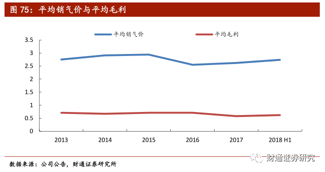 公司售气毛差在2013-2016年都保持在0.7元/立方米附近,2017年四季度和2018年一季度由于气荒造成气源价格大幅上升,毛差在2017年和2018年上半年分别下降至0.58元/立方米和0.62元/立方米。今年四季度由于三桶油对供暖季的燃气供给进行了充分的安排,并未出现气荒现象,公司也提前与下游工商业客户进行了顺价的工作,因此预计下半年的毛差水平将回归较为正常的水平。