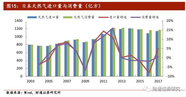 作为岛国,日本天然气基本靠进口,从近十五年的数据来看,日本天然气进口量与消费量基本对应。2017年日本天然气进口量1139.5亿方,同比增加5.04%,天然气消费量1171亿方,同比增加0.6%: