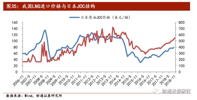 我国进口液化天然气的价格与日本JCC挂钩,目前我国进口液化天然气平均单价为548.02美元/吨(折合0.39美元/立方米)。
