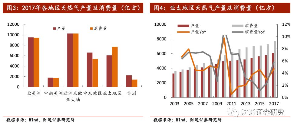 亚太地区天然气消费量提升较快。2017年天然气全球产量为36804亿方,同比增长3.68%,消费量为36704亿方,同比增加962亿方(YoY+2.69%)。受中国地区天然气消费量大增影响,亚太地区天然气消费量增加426亿方(YoY+5.86%),占消费量增加值的44.28%。