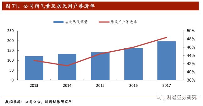 公司燃气销售量维持高速增长的态势,2017年总销气量达196.7亿立方米,同比增长20.9%,2018年上半年销气量123.8亿立方米,同比增长22.9%,预计2018年全年可维持20%以上的增速。居民用户渗透率在2018年提升至49%,未来上升的空间依然很大,居民用户的用气量在未来几年也可以保持稳步提升。