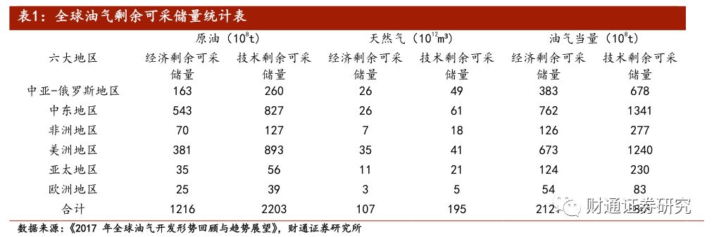截至2017年底,全球油气剩余经济剩余可采储量2121亿吨,技术剩余可采储量3849亿吨;其中天然气经济剩余可采储量107万亿立方米,技术剩余可采储量195万亿立方米。分地区看,美洲地区、中东地区、中亚-俄罗斯地区的经济剩余可采储量分别为35、26、26万亿立方米,而亚太地区、非洲地区、欧洲地区分别仅为11、7、3万亿立方米。