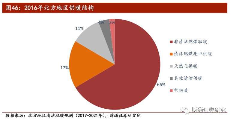 煤改气持续推进,成短期内最重要天然气增量来源。2016年我国发布《北方地区清洁取暖规划》,开始全面推行“煤改气”政策。规划所指北方地区包含北京、天津、河北、山西、山东、河南6个省及直辖市,并囊括“2+26”个重点城市。截至2016年底,六省市天然气取暖面积约14亿平方米,天然气用量185亿立方米,占六省市天然气消费量的36%;“2+26”重点城市天然气取暖面积共约12.4亿平方米,天然气用量160亿立方米,占“2+26”重点城市天然气消费量的38%。根据《规划》提出的发展目标,“2+26”城市2017-2021年累计新增天然气供暖面积18亿平方米,新增用气230亿立方米。按煤改气进度平均进行计算,每年将带来天然气消费量46亿方。