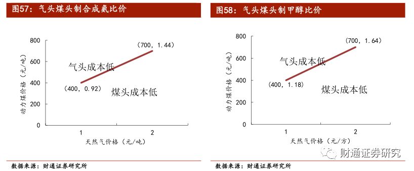 合成氨和甲醇的生产都有煤头和气头生产线,目前我国合成氨和甲醇的生产主要都是煤头的生产线。目前我国天然气制合成氨和甲醇并不具备成本优势:按合成氨对煤/天然气吨消耗为1.5t/870m³,加工成本950/750元计算,当煤价在700元/吨时,天然气单价低于1.44元才具有成本优势;按甲醇对煤/天然气吨消耗为1.6t/1050m³,加工成本1000/400元计算,当煤单价在700元时,天然气价格低于1.64元/m³才更便宜。目前动力煤(山西优混 Q:5500)价格为586元/t,华东地区工业用管道气要约3元/m³,煤制合成氨/甲醇更加便宜。将来若天然气价格下降,则天然气化工仍具有广阔的发展空间。