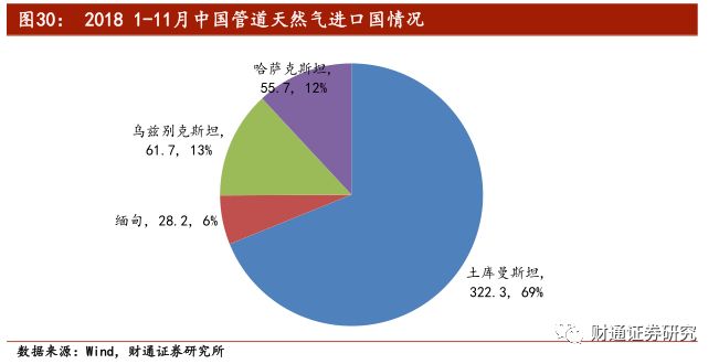 当前,我国主要从土库曼斯坦、哈萨克斯坦、乌兹别克斯坦和缅甸进口管道天然气,2018年1-11月,我国从该四个国家进口天然气占比分别为69%、12%、13%和6%。