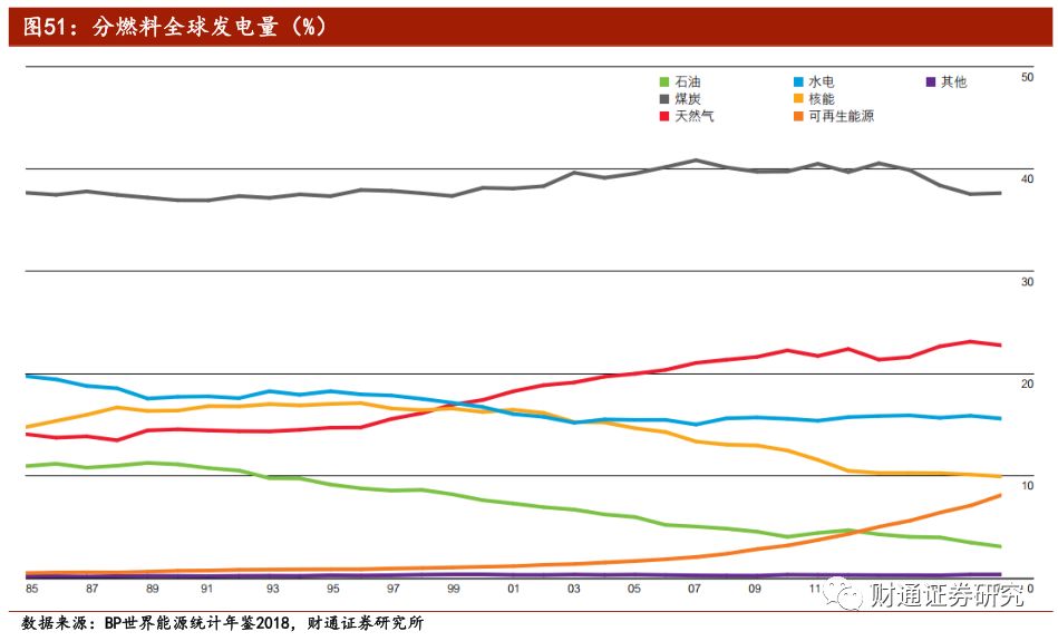根据BP统计数据,全球分燃料发电量中,天然气发电量占比稳定提升,到2017年,全球天然气发电量占比为23.15%。
