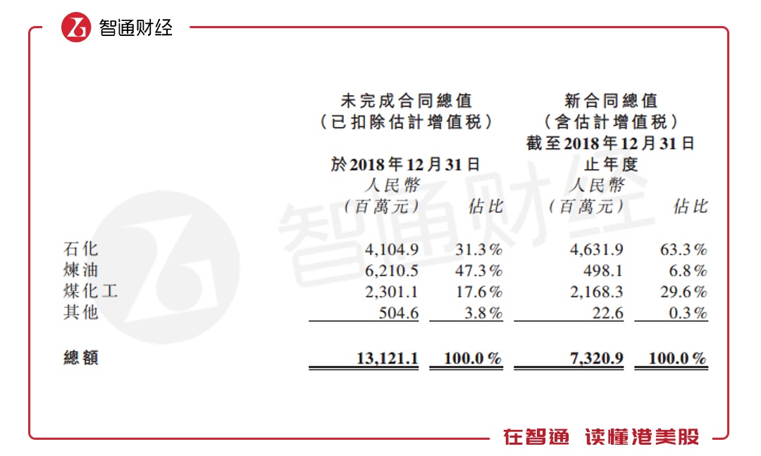 截至2018年12月31日,惠生工程取得新合同总值约为73.2亿元人民币(单位下同),同比大幅增长113.1%。 期内,石化类业务订单规模最大,为46.32亿,其次是煤化工类,新合同总值为21.68亿,占比分别为63.3%、29.6%。