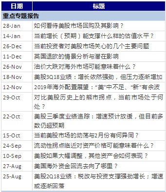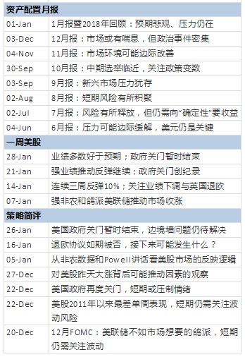 上周美股基本持平,小幅收跌,去年底以来的反弹行情动能趋缓。已披露业绩公司多数仍好于预期为市场提供了支撑,创纪录的政府关门结束及美联储可能提前结束缩表的报道也提振了市场情绪,投资者关注月底(1月30~31日)中美经贸磋商。具体而言,目前标普500指数已披露业绩的100多家公司中,多数仍好于预期,特别是半导体公司业绩超预期推动板块大涨。周六美国国会通过短期融资法案(stopgap),为政府提供资金到2月15日,从而结束了长达34天的政府关门。不过由于边境墙问题仍有待解决,叠加3月1日债务上限将重新生效,仍需关注潜在不确定性。周五,华尔街日报报道美联储或考虑是否应提前结束缩表,美债利率一度回落,美元指数大幅走弱推动金价上涨。下周美联储召开FOMC议息会议,市场关注美联储主席鲍威尔在新闻发布会上的指引。其他方面,英国退欧“Plan