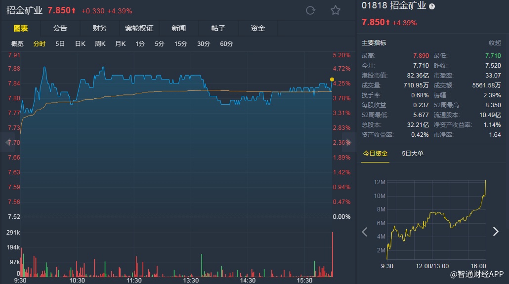 智通财经APP获悉,汇丰证券发表报告称,由于金价上升,故调高招金矿业(01818)2019年净利润预测10%,并相信旗下海域金矿能提供长期产量增长,但对收入的影响仍不确定。该行调高其目标价14.75%,由6.1港元升至7港元,并维持其“持有”投资评级。