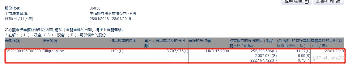 智通财经APP获悉,根据联交所资料显示,花旗集团于1月22日增持中信证券(06030)378万股,每股作价15.20港元,总值约5745.6万港元,最新持股数目约2.52亿股,最新持股量增至11.07%。