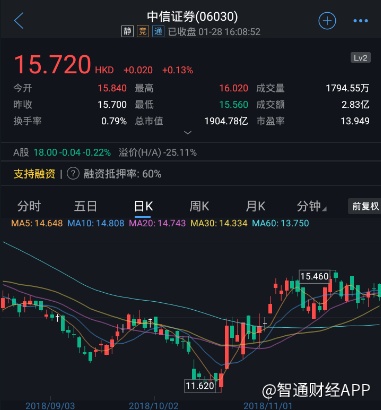 截至今日收盘,中信证券(06030)报15.72港元,涨0.13%。