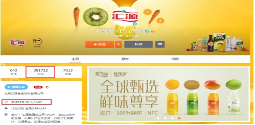 截至2019年1月28日下午3时许,汇源果汁(01886)的官方微博已经更新了7013条微博,这一刻官微的粉丝数量为381732名。