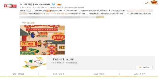 与众多企业官微空有粉丝数量没有粉丝活跃度不同,汇源果汁的热门微博时常能获得数百条的评论及转发,可见,在互联网的世界里汇源果汁还可以“玩”得风生水起。