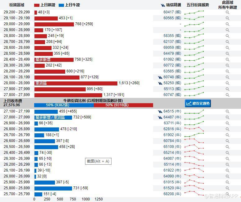 智通财经APP获悉,截至1月28日,恒指最新的牛熊街货比例50:50。从瑞信恒指牛熊证街货分布图中得到的数据显示,熊证街货重货区在28000-28099区间,该区间最新熊证数量为1613张,较上一交易日增加260张,最多新增区间为28400-28499,新增325张。牛证街货重货区在27000-27099区间,该区间最新牛证数量为732张,比上一交易日新增509张,最多新增在同一区间。