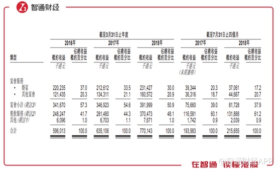 不过也可以看到2017年和2018年5、6、7三个月累计净亏损1521万、2238万港元,这是因为酒楼的业务受到季节影响显著的原因。其中婚宴的波动尤其明显,由于在9月份(下半财年)是婚宴项目的高峰,因此婚宴项目收入下半年一般占到全年的70%以上。首次影响,总收入在下半年一般也能占到全年的60%以上,但是全年的运营成本是比较稳定的,因此造成了上半年亏损,下半年暴利的情况。