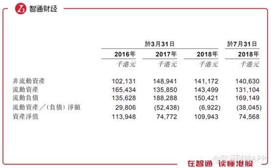 另外由于新增项目投入,导致从2017财年开始,流动资产净额由正转负,负债比升高,2018财年流动资产负债为692万元,现金流方面也有小幅缩窄,从2016财年的1.2亿降至2018年7月份的8986万。