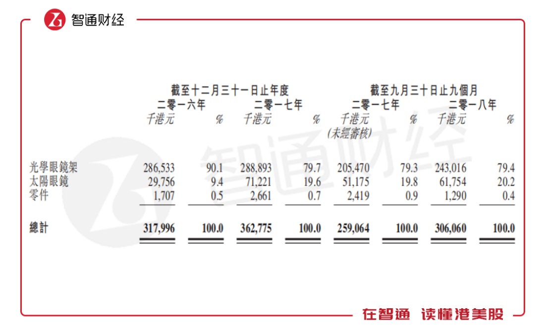 公司的产品主要包括光学眼镜架及通常由金属或醋酸脂或两者混合制成的太阳眼镜。于往绩记录期,公司制造合共超过3200种光学眼镜架及太阳眼镜的多元化产品组合。总体来看,截至2018年前三季度公司光学眼镜架的收入达到2.43亿元,占营收比重79.4%。