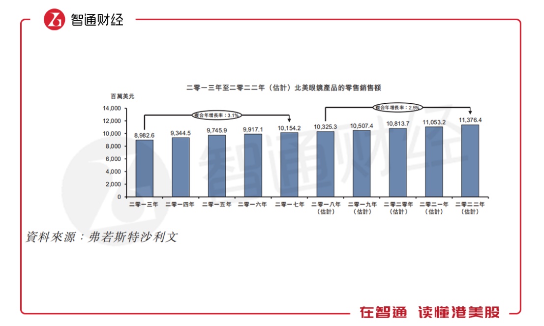 首先从需求角度来看,根据弗若斯特沙利文报告,北美眼镜产品的零售总额由2013年的约89.83亿美元按3.1%的复合年增长率增至2017年的约101.54亿美元。预计北美眼镜产品的零售额在2018年至2022年期间将以2.5%的复合年增长率增长至113.76亿美元。