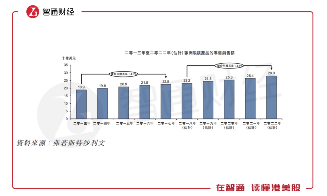 欧洲市场方面,其眼镜零售额由2013年的189亿美元增至2017年的225亿美元,复合年增长率为4.5%。预计2018年至2022年欧洲眼镜零售额将以4.8%的年均复合增长率增长至280亿美元。
