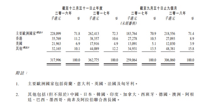 据弗若斯特沙利文报告称,就其贸易价值而言,公司的销售覆盖所有2017年全球十大光学眼镜架进口国家。其中,截至2017年12月31日止2个年度及截至2018年9月30日止9个月,公司对欧洲的销售额分别合共占公司收益超过70%。