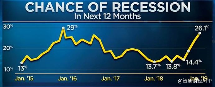 上周,当美国政府仍然关闭时,根据CNBC的调查显示,未来12个月美国经济衰退的可能性上升到26%,这是连续第三次上升。在另一次市场抛售之后,也就是在2016年1月,这一概率上升了近29%,这足以表明调查受访者对市场波动有多敏感……