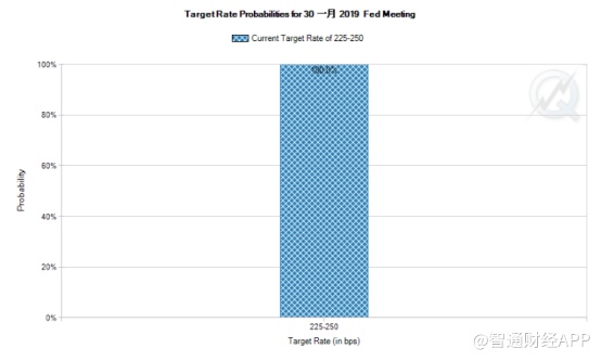 据CME“美联储观察”显示,美联储今年1月维持利率在2.25%-2.5%区间的概率为100%,加息和降息的概率均为0%;今年3月维持利率在该区间的概率为98.7%,加息和降息的概率分别为1.3%和0%。
