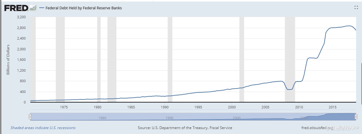 从下图可以看出,美联储持有的联邦债务在2017年达到峰值,然后缓慢减少。