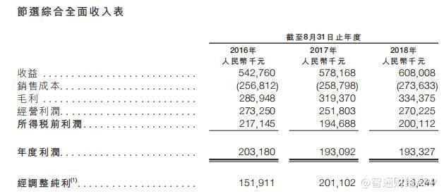 其收益由截至2016年8月31日止年度的人民币5.428亿增至截至2017年8月31日止年度的人民币5.782亿元,截至2018年8月31日止年度进一步增至人民币6.08亿元。我们的毛利由截至2016年8月31日止年的人民币2.859亿元增至截至2017年8月31日止年度的人民币3.194亿元,截至2018年8月31日止年度进一步增至人民币3.344亿元。截至2016年、2017年纪2018年8月31日止年度,我们的毛利率分别为52.7%、55.2%及55%。