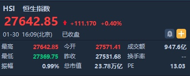 智通财经APP获悉,恒指早盘高开,随后下探回升,于平盘线附近窄幅震荡,尾盘又迎快速拉升。截至收盘,恒生指数涨111.17点或0.4%,报27642.85点,全日成交额达947.63亿。国企指数涨0.27%,报10897.13点,红筹指数涨0.42%,报4341.5点。