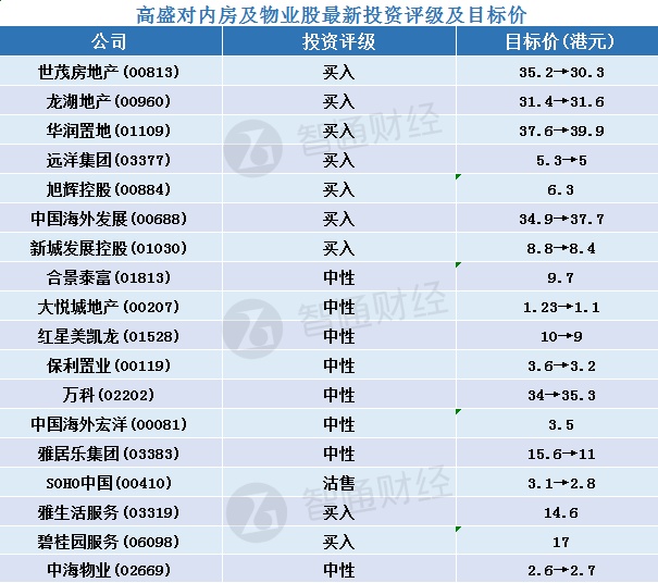 一、高盛对内房及物业股最新投资评级及目标价汇总