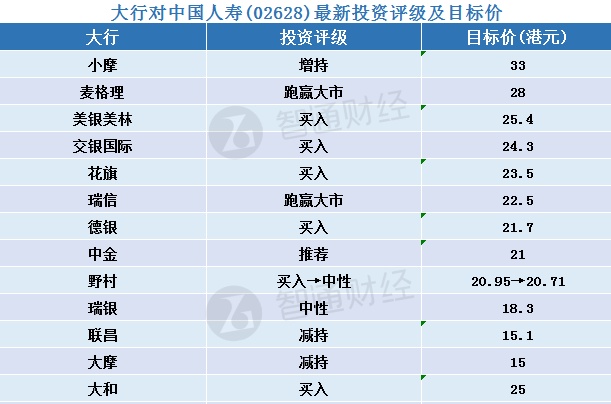 二、大行对中国人寿(02628)最新投资评级及目标价汇总