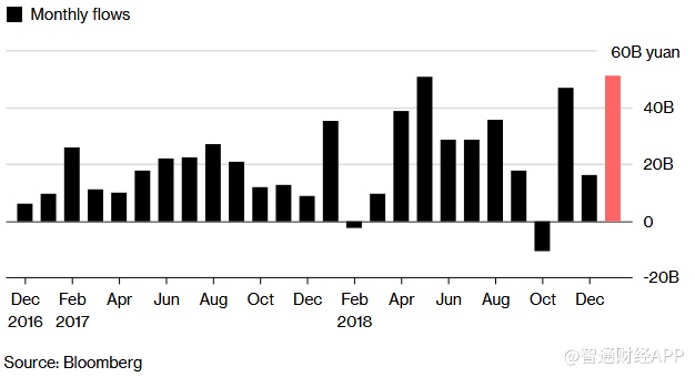 在今年1月份,外资买入量录得创记录新高:
