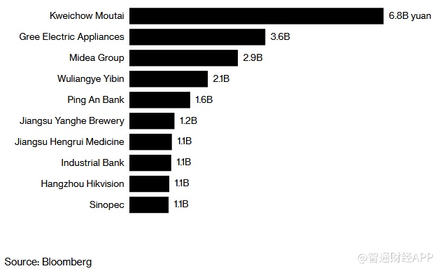 其中最受热捧的前十支股票分别为:贵州茅台(68亿元)、格力电器(36亿元)、美的集团(29亿元)、五粮液(21亿元)、平安银行(16亿元)、洋河股份(12亿元)、恒瑞医药(11亿元)、兴业银行(11亿元)、海康威视(11亿元)、中国石化(11亿元)。