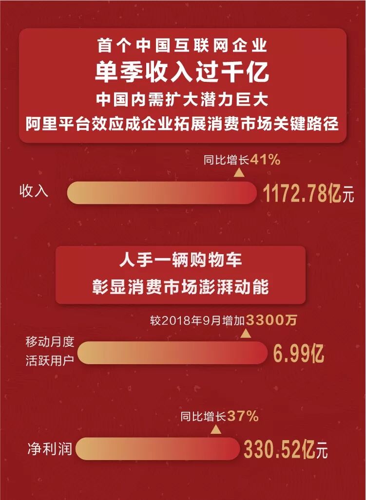 智通财经APP获悉,阿里巴巴(BABA.US)公布2019财年第三季度业绩,集团收入同比增长41%达1172.78亿元,为中国首个单季营收破千亿的互联网公司。