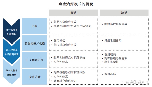 基石药业的研发核心是肿瘤免疫的联合疗法。癌症治疗领域经历了三次重大变革,第一次从手术转向化疗药物,第二次从化疗药物演变至分子靶向药物,第三次则转至免疫治疗。