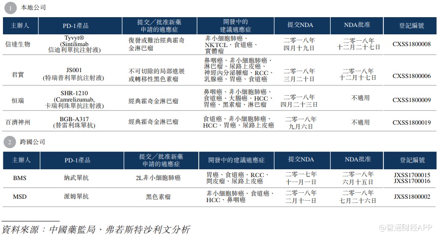 截至2018年12月,中国获批准的PD-1疗法有4种,分别为百时美施贵宝的OPDIVO ® (纳武单抗)、MSD的KEYTRUDA ® (派姆单抗)、君实的特瑞普利单抗及信达生物的Tyvyt ® (信迪利单抗),无获批准的PD-L1疗程。