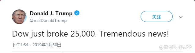 直至今天,美联储宣布其鸽派立场,如期不加息后,特朗普又开始发布与股市相关的推文。他写到: “道指刚刚突破了25000点,这真是一个极好的消息!”。可以说,鲍威尔已在市场压力面前投降了。