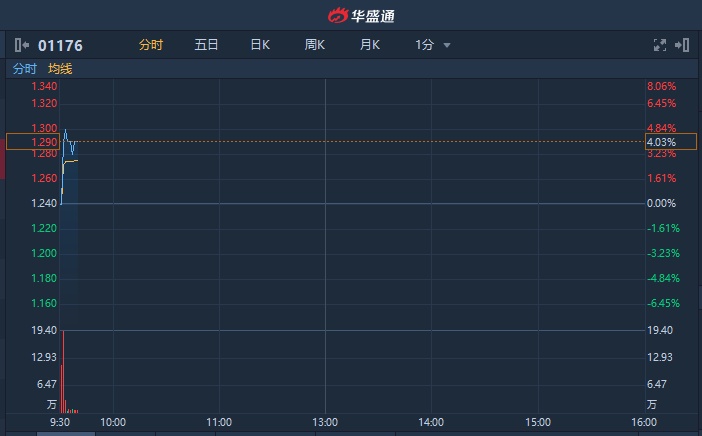 智通财经APP获悉,珠光控股(01176)早盘获强力拉升,截至9时39分,涨4.03%,报1.29港元,成交额46.83万港元。