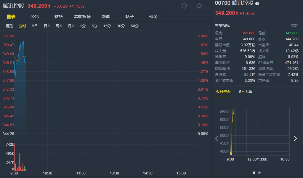 智通财经APP获悉,腾讯控股(00700)ADR收报350.19港元,较港收市升5.99港元。腾讯控股今早盘前走势不错,正迈向350关,该股现报349.2港元,升5.0港元,升1.45%。