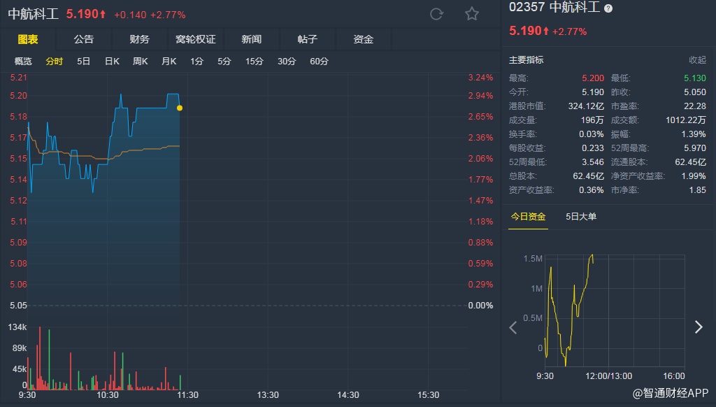 该行认为,近期中航科工股价向下,令短期估值相当吸引,称市场忽略了中航科工持有43.77%的洪都航空(600316.SH)发盈喜,预计净利将同比增长334至399%。