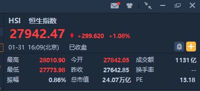 智通财经APP获悉,恒指早盘跳空高开,震荡上行,一度站上28000,午后涨幅收窄,成交量较上一交易日放大不少。截至收盘,恒生指数涨299.62点或1.08%,报27942.47点,全日成交额达1131.54亿。国企指数1.27涨%,报11035.73点,红筹指数涨1.05%,报4387.09点。因春节临近,港股通于今日关闭。