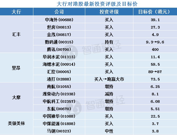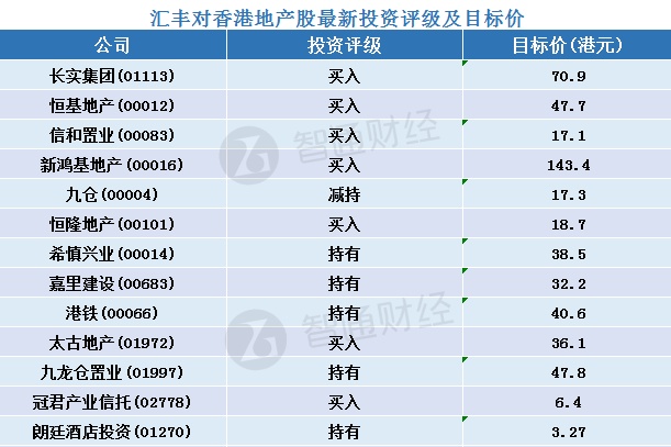 一、汇丰对香港地产股最新投资评级及目标价汇总