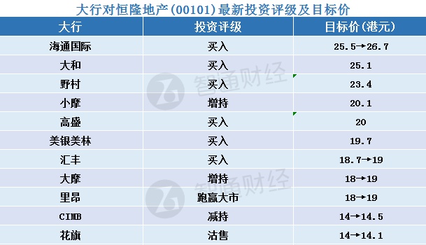 二、大行对恒隆地产(00101)最新投资评级及目标价汇总
