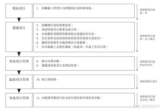 于往绩记录期间,该公司收益主要来自(i)提供技术製作及创意解决方案服务的服务费;(ii)销售演唱会门票;及(iii)演唱会赞助收入。