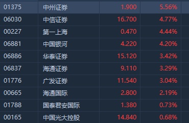智通财经APP获悉,今日A股券商板块大涨,带动港股中资券商股走强,截至发稿,中州证券(01375)涨5.56%,中信证券(06030)涨4.77%,中国银河(06881)均涨超4%,华泰证券(06886)、海通证券(06837)、广发证券(01776)涨超3%。