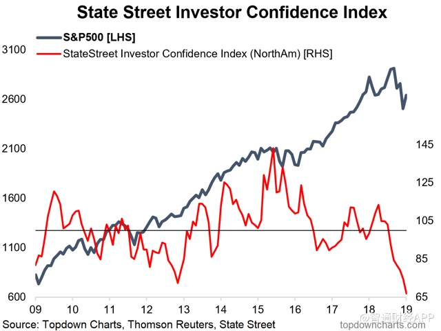 机构投资者信心指数:1月份公布的道富环球投资者信心指数(State Street investor confidence index)显示,北美地区指数已降至近十年来最低水平。据智通财经APP了解,该指数能够明确反映投资者风险偏好的变化,风险资产(例如股票)在资产配置中占比越大,投资者风险承受能力或信心则越高。指数读数100为中性,高于/低于100代表投资者增加/减少了其对风险资产的长期配置。
