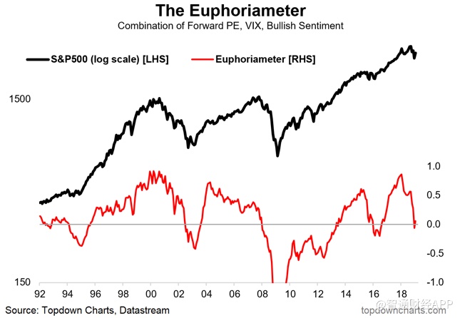 市场热度指数:Topdown Chart独家设计的市场热度指数(Euphoriameter)是衡量投资者情绪的综合指标。由于负面消息在市场上接连出现,该指数从去年1月份的“极度狂热”,大幅回落到了去年12月份的“轻度悲观”。该指数是由平均市盈率预期值、隐含波动率及市场看涨情绪指数三大指标按照特定标准加权平均计算得出。