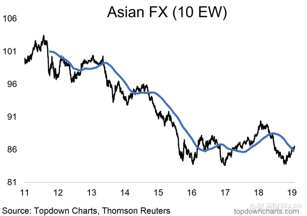 亚洲货币指数:紧随美联储暂停加息及让资产负债表更具弹性的鸽派言论,Topdown Chart的亚洲同等加权货币指数(equal-weighted Asian FX Index)已突破其200天均线。在美联储鸽派政策的助推下,亚洲一众货币有望释放积压已久的做多情绪,开始走强。