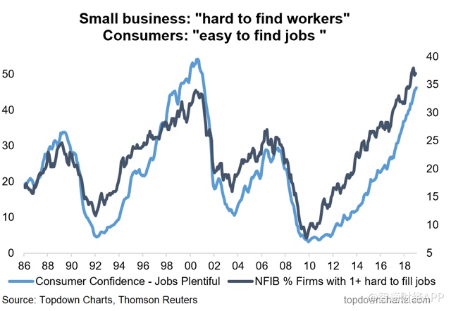 美国劳动力市场信心指数:众所周知,就业数据通常是滞后指标,但最新的劳动者信心指数显示,求职者对就业前景充满信心。正如图表所显示的:小企业很难找到雇员,而求职者则认为找到工作较容易。